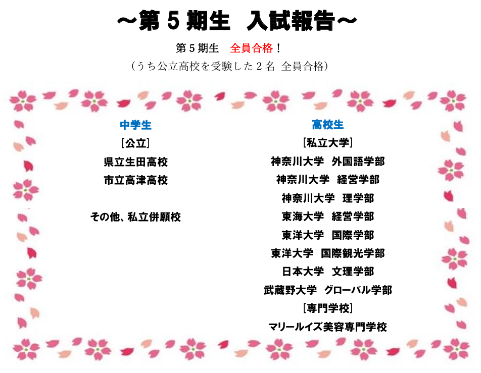先日ご報告(高校入試 / 専門・大学入試)したように、今年度も全員が志望校に合格しました🌸